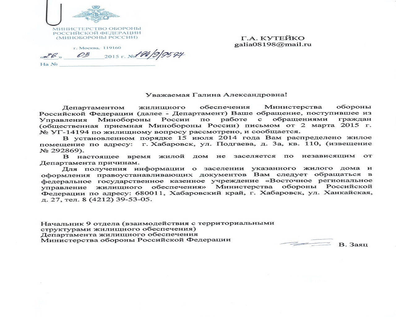 Корешок 2 к извещению о предварительном распределении жилого помещения- слово предварительное есть я ошибся,но в письме с москвы есть данные о распределении про временное ничего нет .