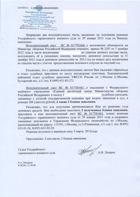 Если же в решении нет конкретной суммы ("внести изменения в приказ", "назначить и выплатить денежное довольствие" и т.п.), то ИЛ отправляйте в службу судебных приставов. Номер счёта хоть на отдельном листе пусть Вам банк напечатает.