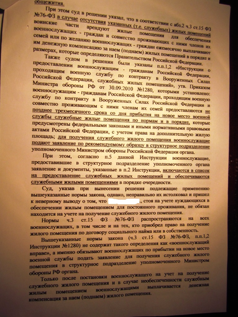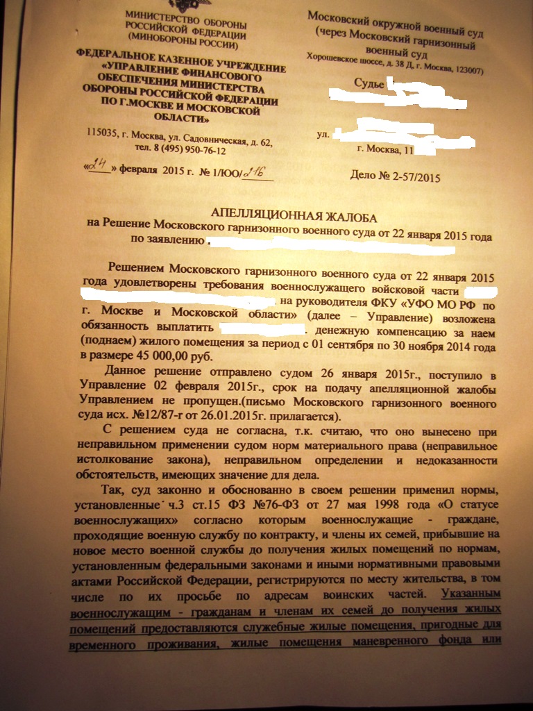5-Й лист апелляционной жалобы это просто КВН. Спустя 4 года, как ВОЕННОСЛУЖАЩИЕ получали денежную компенсацию за наем (поднаем) жилья, начальник УФО вдруг одумывается и вспоминает, что ему необходимо выполнить указание Начальника Генерального штаба МО РФ № 307/1/314 от 13 сентября 2011 г. А до этого времени, было необязательно исполнять данное указание? :lol: