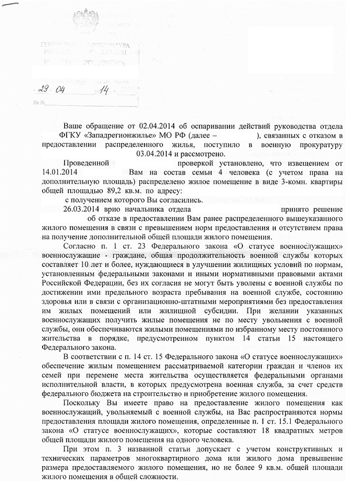 Разумеется приложили справку с женской консультации ( предположительный срок родов 5 июня 2014) Начальник отдела №4 ФГКУ «Западрегионжильё» МО РФ отказал, т.к. постановление давно отменили. Отказ в письменной форме. Что делать ? Идти в прокуратуру? Тянуть время до родов не можем, так как принуждают срочно заключить ДСН ( квартира в Санкт-Петербурге, но дом ещё не сдан)