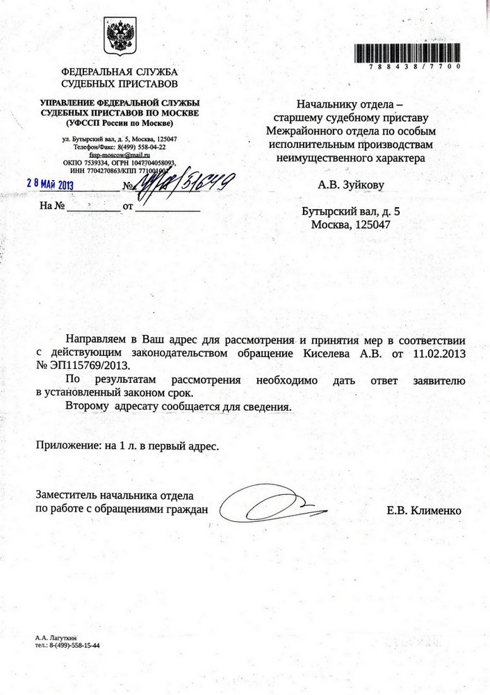 Как выразился один из участников форума - тухлый номер. Если есть знакомые в Москве пусть похлопочут. На мое заявление в феврале, когда будет исполнено решение суда, пришел ответ два дня назад.В кол-центре ССП посоветовали написать заявление на имя начальника этого отдела.