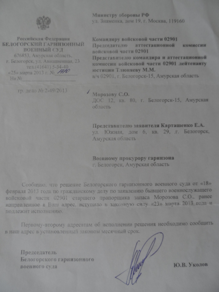 2. Решение суда ему было отправлено? (отправляется заказным письмом с уведомлением о вручении).