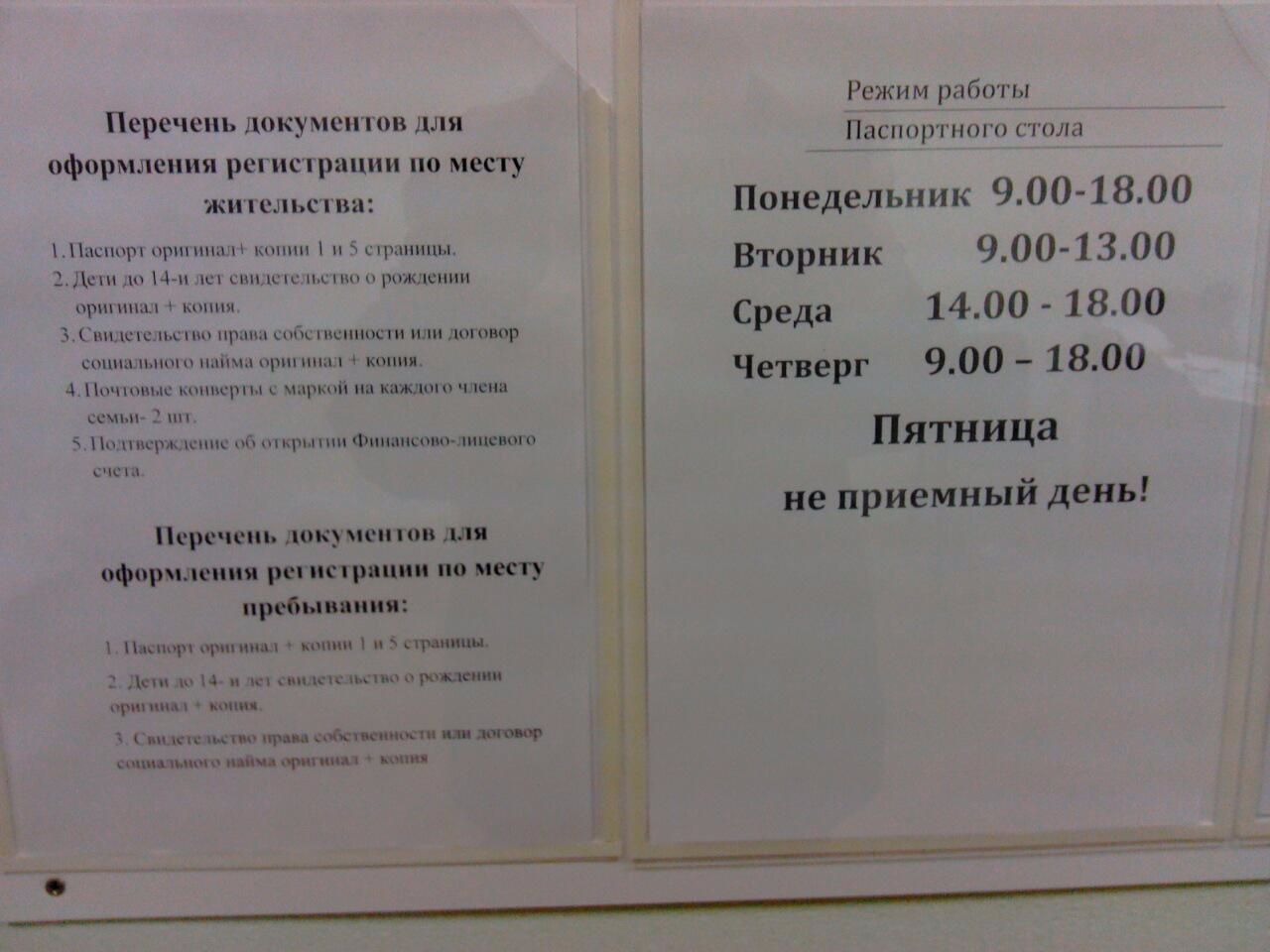 Паспортистко работает заметно чаще(в среду до обеда ходит в УФМС с доками), выдаёт и принимает доки в любой день.