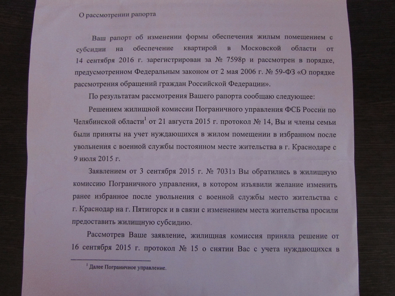 ... в связи с отсутствием финансирования прошу изменить форму обеспечения с жилищной субсидии на предоставление жилой площади по избранному месту жительства...