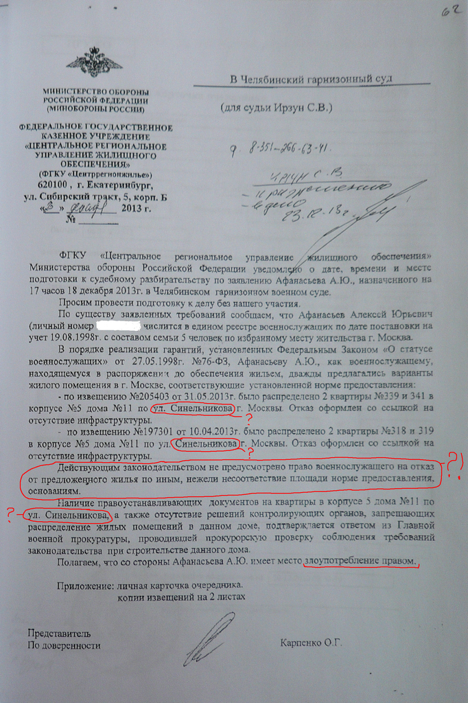 #23339Синельникова.... в Москве то и улицы такой нет!Не понятно как они хотят уволить не желающих служить без жилья, это ведь противоречит закону о статусе БредОчень просто это получается(ну в ЦВО точно), имею ввиду- уволить. Главное, чтобы были "неоднократные", больше одного, отказыНо вот же беда, никак они не могут придумать, как избавиться от расходов на дд заштатников, без расходов на их же (заштатников) жилищное обеспечение))). Потом командующий своим решением "назначает" такого в/сл. главным злоупотребителем права, шлё теллеграмку кадровикам: "Представить, мерзавцев!" и... до свидания, идите в наш самый гуманный суд в мире. А у ЦВОшных джопников(Ёбург) вообще своё законодательство, однако, по которому военнослужащий не имеет права отказываться не по чему, кроме как по несоответствию площади предоставленного помещения. Причём, как я понимаю, по "их" логике, помещение и не должно обязательно быть жилым.