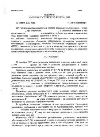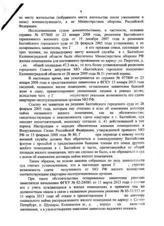 Надо смотреть сам отказ... А судя по обстоятельствам, имеете право на получение жилья за вычетом причитающейся части... ИМХО. Сам такой (почти). Будут цепляться за отсутствие справки о сдаче жилья. Суда, наверное, не избежатьСитуация такова: в 2000 г. мать жены (тёща) внесена в гр. 21 послужного списка личного дела как состоящая на иждивении. Проживала со мной. Подал рапорт на УЖУ и признан нуждающимся. В 2003 г. брак расторгнут. Квартира 2-х комнатная 47,1 кв.м. общей площади. Есть 2 решения суда о неделимости квартиры. Все меры к обмену и выделении доли жилья предпринял. Есть 2-ва разрешения заместителя командующего МВО по СиРВ о постановке на очередь одного и переводе лицевого счета на бывшую жену. Квартира приватизирована на бывшую жену и дочь. До сих пор там прописан. Распределили квартиру в Подмосковье. Дал согласие. В настоящее время, с учетом судебной практики, отказано в распределенном жилье так как не могу сдать ранее полученное в 1988 г. Не могу понять сняли меня с учета или только отказали в получении по ДСН распределенного жилья, т.к. имею право на получение жилья с учетом вычета доли в ранее полученном. В единый реестр войти не могу с 24.04.2013 г. Надпись что личный номер не найден, по логике сняли с учета, но на ГЛ сказали что в реестре состою. В ближайшее время поеду в 1 отд ЗРУЖО СС за отказом. Далее в суд. Но судя по судебной практике перспективы положительного решения нет. Кто, что думает?