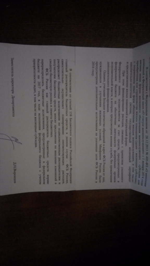 #2408А про 2017 год они молчат. Отписка, умными словами. "..учитывая большое количество обращений в адрес ФСБ...". Кто то явно врет! Какое большое количество обращений, что за слово обращений! Гарант на коллегии ФСБ говорил;- февраль 2016: «…в 2015 году введены в эксплуатацию 98 ведомственных домов…» и разговор про постоянное жилье уже не шел;Пришел ответ из Минфина. В общем, как я и думал. Учитывая большое количество заявок, на 2016 год были выделены даже дополнительные средства, но они пошли на совсем другие цели.