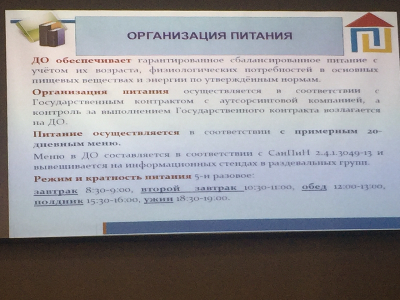 немного не так ...QR_BBPOST Питание 5-ти разовое. Завтрак 8.30-9.00.Ужин 18.30-19.00. Из хороших новостей, то что будет готовиться именно в саду, а не как в школе только разогреваться.