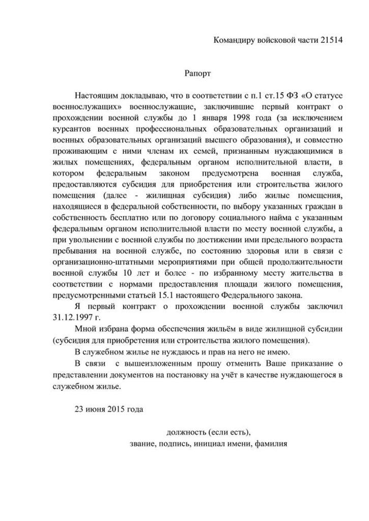 А если я напишу *в служебном жилье не нуждаюсь*не станет ли это основанием для моего увольнения вообще без жилья ? Ведь меня не увольняют только по причине необеспеченности жильем по месту службы.