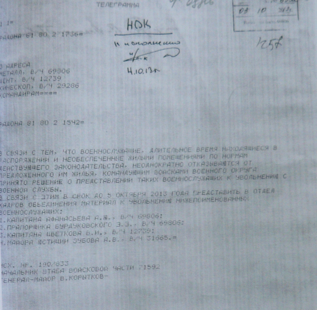 #25439Да документик очень простой- телеграмма. Меня вот по этой уволили. Всё очень просто. И если и можно восстановиться, то только не через военный суд.А документик можно в студию или пока хоть приблизительное содержание?Отказников от Молжаниново приказом командующего округом (присланным по факсу без синей печати) УВОЛЬНЯЮТ!!!