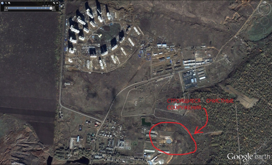 На очистных шевеления не наблюдалось. Стоит кран, вагончики, насыпана дорога из щебня. Плаката с названием фирмы и проводимых работ нет.