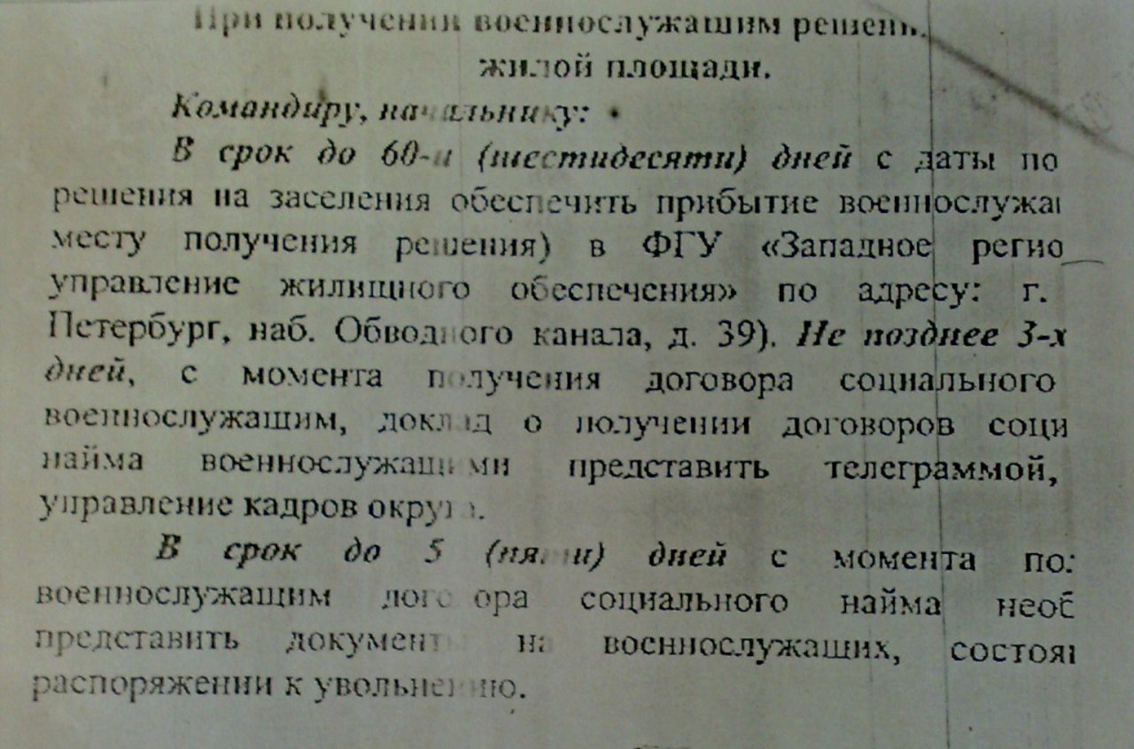 Нам на днях скинули факс. Разъясняют действия КЧ и военнослужащих. Плохо видно,но смыс понятен. Шапка- При получении телеграммы о распределении военнослужащим жилой площади.