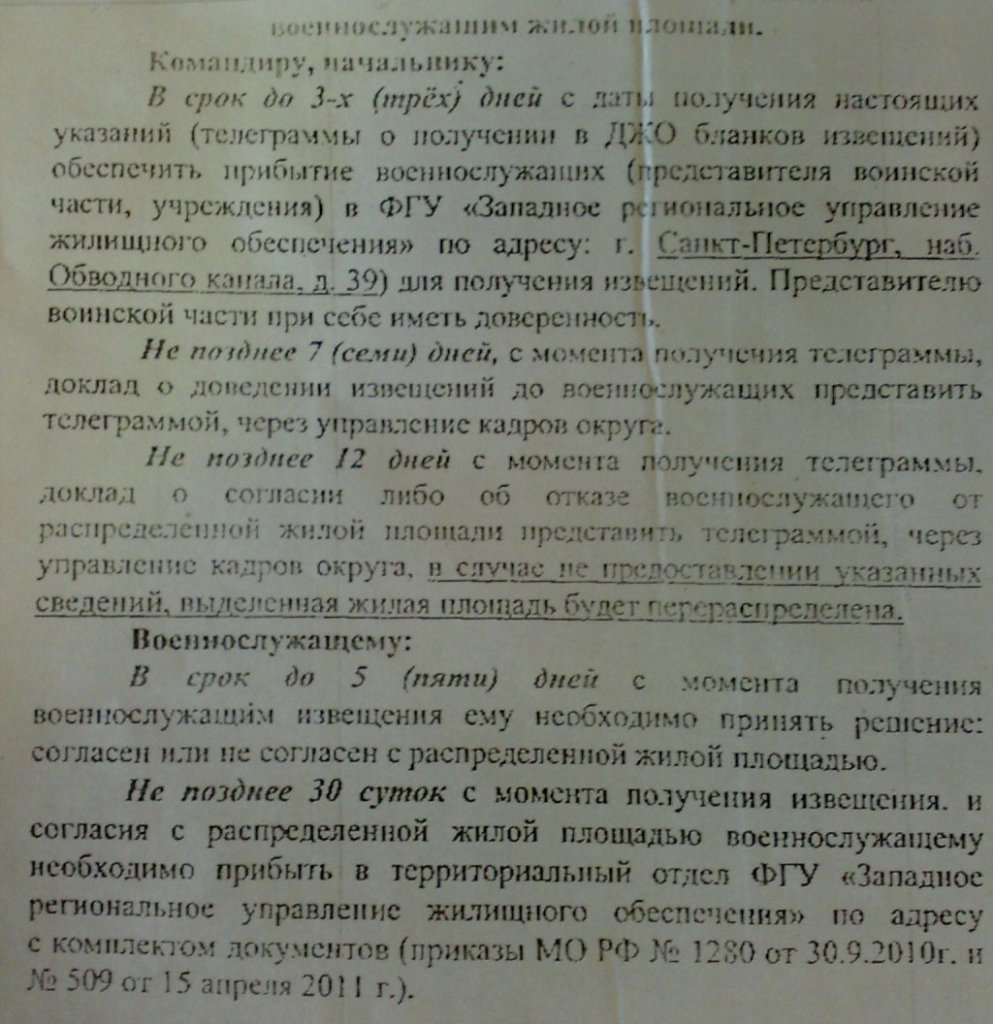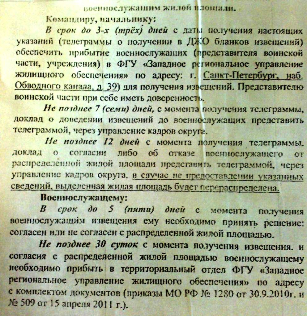 Нам на днях скинули факс. Разъясняют действия КЧ и военнослужащих. Плохо видно,но смыс понятен. Шапка- При получении телеграммы о распределении военнослужащим жилой площади