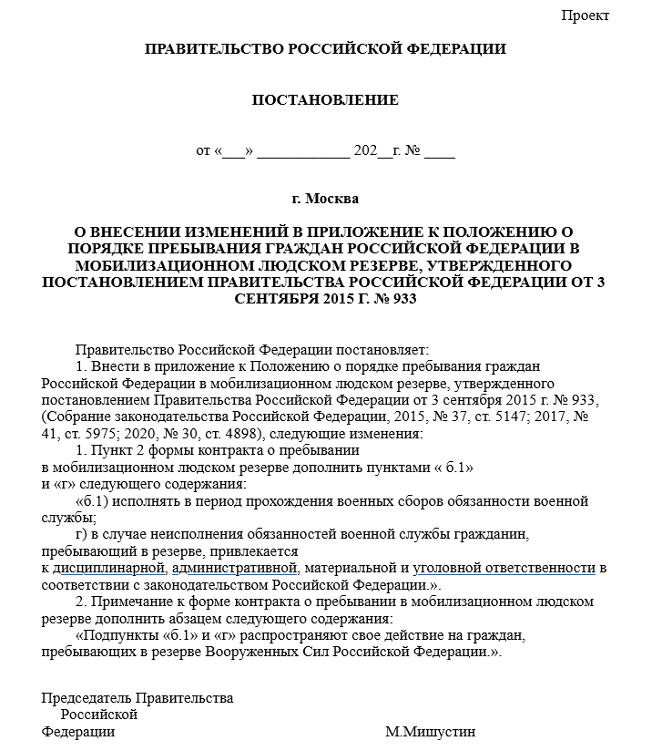"Проект постановления Правительства Российской Федерации "О внесении изменений в приложение к Положению о порядке пребывания граждан Российской Федерации в мобилизационном людском резерве, утвержденного постановлением Правительства Российской Федерации от 3 сентября 2015 г. № 933""