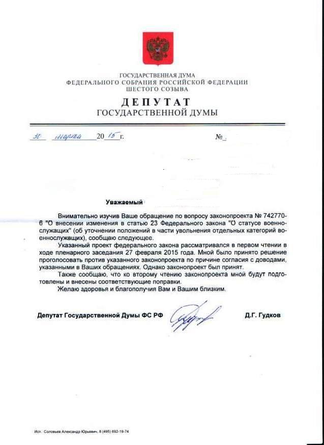 По поводу отправленных обращений, КПРФ отписалось, что получило и работает, а вот по поводу Хованской не знаю, а вот хотелось очень чтобы она получила, может и воспользовалась бы моим обращением с приложением письма ВРУЖО как козырем при обсуждении законопроекта. Сейчас буду смотреть сайт Думы по депутатам от нашего региона, хочу найти депутата от Единой России и выложить ему свои материалы а после затребовать ответ, должны же они работать с обращениями избирателей.