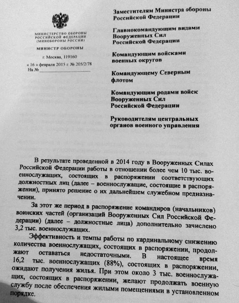 #27000Думаю, что на основании Вашей "бумажки", была другая последующая от зам.МО(с разъяснениями и порядком оформления списков), на основании этих списков(сведений) поданных командующими(кадровыми органами) округов в РУЖО формируют так сказать"льготную" очередь состоящих из распоряженцев.QR_BBPOST Вы это имели в виду...?