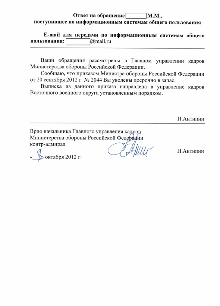 Продолжение:30.03.2012 - оформлены документы на увольнение в в/ч