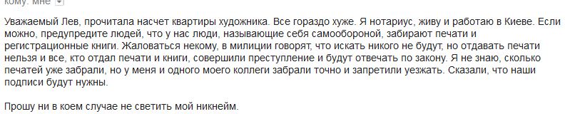 Интересная деталь: к ее коллеге, о котором идет речь в письме, опять приехали, вернули печать (надо полагать, сделав копию) и велели написать расписку в получении двух тысяч гривень "за сотрудничество". Возражения не приняли. Две тысячи гривень честно отдали, записав передачу денег на видео. Моя собеседница уверена, что скоро приедут и к ней.