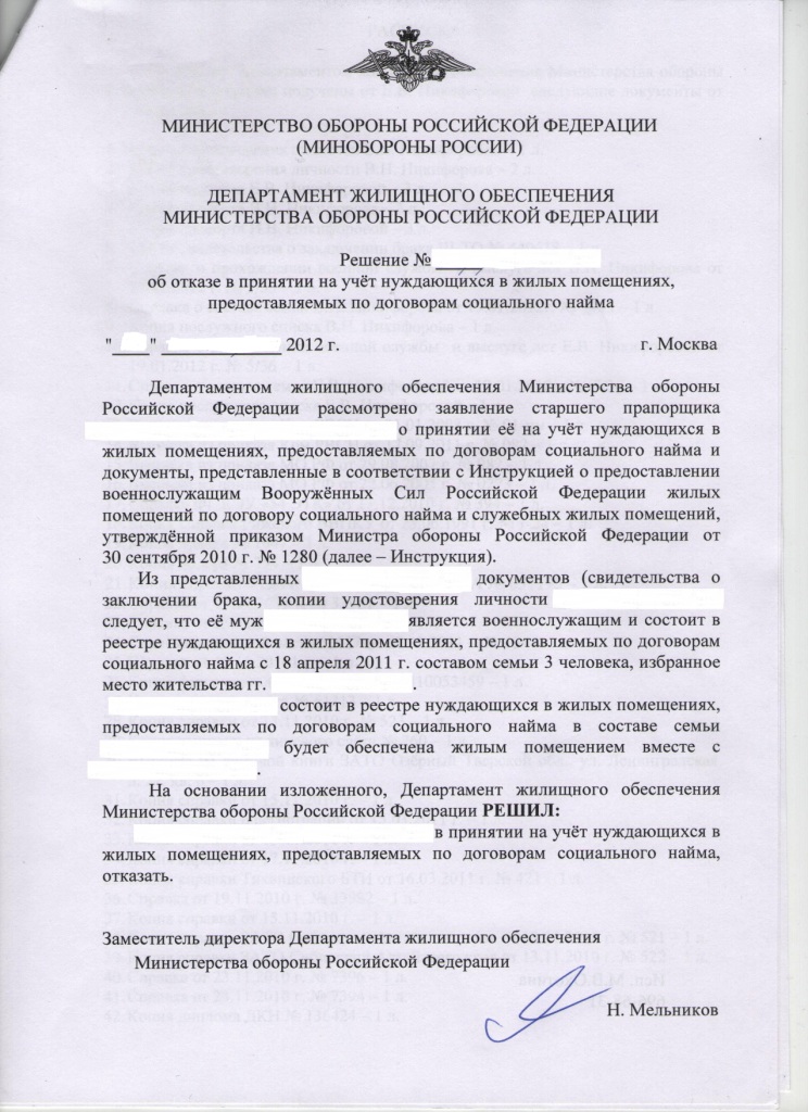 [quote="Jei_Niki"]В каком НПА указано, что при наличии в семье 2 военнослужащих только 1 из них имеет право "стоять в очереди"?[/quote Идите в суд. Мало ли что в жизни бывает пока ждут жильё. А как же : муж с женой стоят каждый в разных очередях(один у муниципалов, другой в ДЖО) и никто не снимает одного из них с очереди. Вот когда будете получать жильё на своих законных членов семьи, вот пусть тогда и разбираются со второй половиной и снимают тогда с учёта того, на кого получает первый счастливец. Ваш шанс получить квартиру удваивается, т.к в лотерее участвуете вдвоём и "яйца кладёте в одну корзину". Но это моё мнение, про соответствующие НПА не знаю, таковых, наверное, в природе не существует.