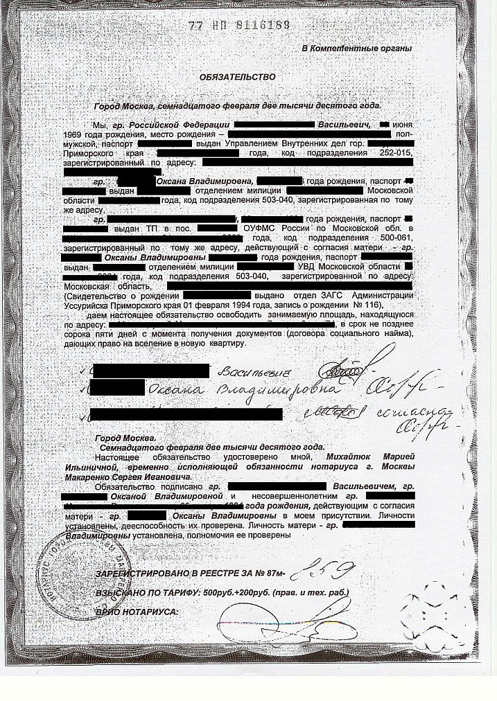 18. Обязательство совершеннолетних членов семьи об освобождении ими после получения. жилого помещения ранее занимаемой жилой площади, заверенное нотариусом