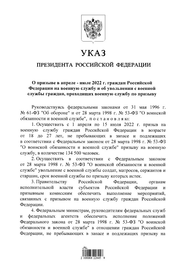 "О призыве в апреле - июле 2022 г. граждан Российской Федерации на военную службу и об увольнении с военной службы граждан, проходящих военную службу по призыву"