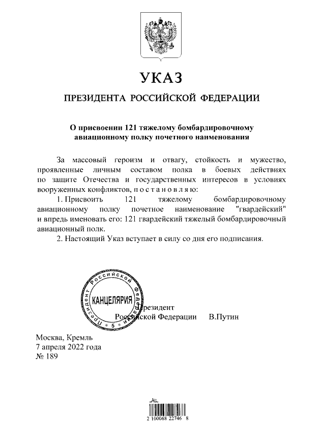#2835Указ Президента Российской Федерации от 07.04.2022 № 189