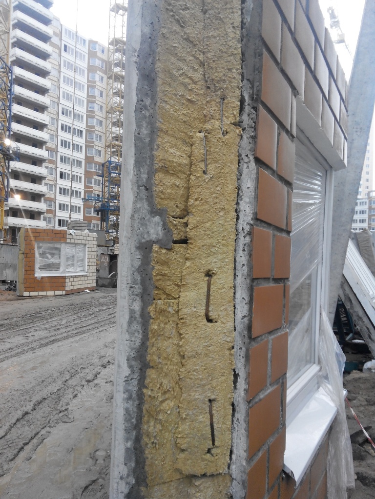 Посмотрите любое фото с любой стройплощадки, где видны торцы несмонтированных внешних (фасадных) панелей. Там горючей ваты 50 мм между панелью и имитацией фасадного кирпича.