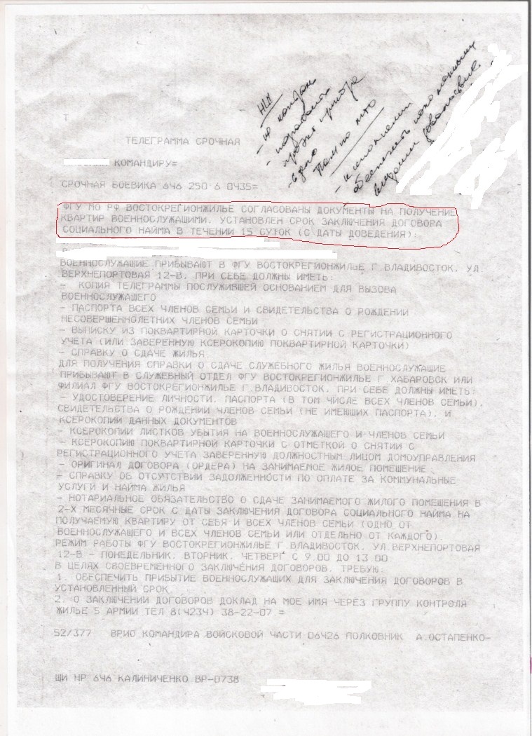 Добрый вечер всем. Вот и я дождался, сегодня довели тлг с требованием прибыть в Хаб для заключения ДСН, причём срок - до 15 марта, иначе ... расстрел через повешание с вырыванием гланд через ж... Так и написано, только завуалировано под приличные фразы. Короче, с таким чувством как у меня после прочтения тлг шли, наверное, по вызову в НКВД в 37-м. Поразил бредятиной очередной странный список необходимостей, которые должны быть при себе для заключения ДСН в Хабе, перечислю меня касаемое: справка о сдаче жилья (синька) - одобрям, заполненные сведения о наличии (отсутствии) жилых помещений на праве собственности (заверенные КЧ) - ????????, копии ИНН на всех (заверенные КЧ) - ???????, обновлённую справку о сроках и статье увольнения - ????????, оригинал документа об оплате суммы компенсации - понятно. Сведения, копии, справка ранее уже сдавались, зачем опять огород городить? Вопрос, конечно, риторический, но не понятно кто там рулит. У одних одно требуют, у меня другое. И как теперь быть остальным? Из тех списков доков, которые ранее выкладывали уважаемые участники наших диспутов, мало что совпадает с моим перечнем, ни у кого сведений, копий ИНН и др. ерунды не требовали. Может у них очередной новый облик, а мы не в курсе?