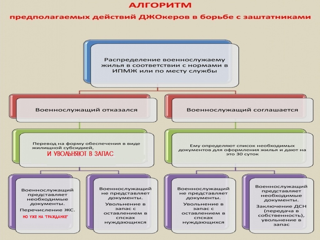 Нет, смысл он не теряет. Но ДЖОдеи будут трактовать это так. Отказался воин от квартиры в ИПМЖ (по месту службы) и по нормам, значит подлежит увольнению, а параллельно включается механизм п.19 с переводом на ЖС. Я раньше думал, что сначала всё же должны хоть чем то обеспечить. Но теперь уверен, что выкинут на улицу ждать субсидию за воротами части. А вот, там, за воротами хочешь тяни кота за хвост и радуйся свободе, а вот если хочешь получить свою законную субсидию, тогда быстренько, заискивающе заглядывая в глаза тётеньке-ружопнице неси всё, что скажут и на что намекнут, включая и ... положенные 2 документа по пр.510. Так что алгоритм борьбы с воинами теперь видится мне несколько иначе, чем раньше.Как я понял, то п.19 ст.15, при применении поправок в 23 статью, теряет свой смысл...