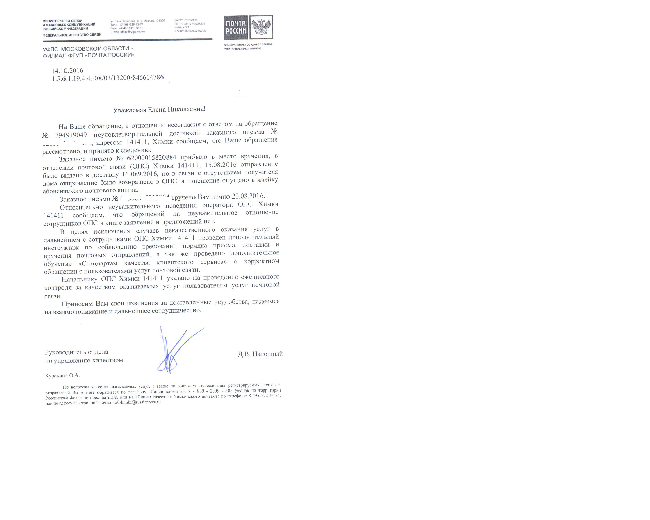 #28985Вот время жалко, или «продолжить сотрудничество» с почтой России. Уже 2 жалобы написала в местное почтовое отделение на отвратительное обслуживание. Дело в том, что ждала важное заказное письмо. Накануне зашла в отделение и непосредственно у нач.отделения спросила – самой ходить или будет уведомление? – Не волнуйтесь, будет уведомление. Мне уже сообщили, что письмо отправлено, а уведомления нет. По индификатору увидела, что оно давно доставлено. Устало оператору говорю – ну что же Вы даже не уведомили, ведь нач. обещала. Дело было в субботу и на закате раб.дня. В ответ она на меня всех собак спустила и в заключение – мы вас вообще не должны обслуживать. Удивленно на нее посмотрела, не готовая к такому хамству и пребывая в спокойном расположении духа. Она – не надо на меня так таращиться. Я тоже могу глаза выпучивать. Тут я уже напряглась, пришла в чувства. Говорю – не хотите ли извиниться? В курсе, что клиент всегда прав (даже если он не прав)? Но (может у нее что-то случилось или обида, что работает в выходные) ее несло все дальше. Тогда я запросила жалобную книгу и предупредила, что придется отвечать за свои ошибки или извиниться. В итоге написала жалобу на сайте почы РФ. Получила чумачечий ответ – дескать, мне его лично вручили. Это при том, что я сама вычислила и пришла. Сей же миг запустила жалобу на отписуна. В результате наметился диалог (оказывается и в книге жалоб нет моей жалобы. Т.е. ее вырвали). Мне не составляет труда тут же закатить 3 жалобу, благо есть инет, но как же все задолбало. Ладно было бы хоть наше почтовое отделение, так ведь сколько сил нужно чтобы бороться с окружением. В Екб. на почте меня все в лицо уже знали и с порога рапортовали. Но уже так хочется мирно и чтобы каждый отвечал за свой участок. Или уже оставить как есть.