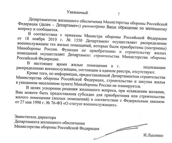 Кроме того, обращение следует направлять на имя директора Департамента жилищного обеспечения МО РФ Пирогова С.В.