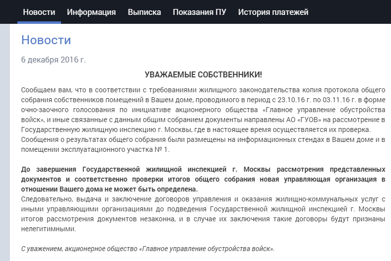 Сообщаем вам, что в соответствии с требованиями жилищного законодательства копия протокола общего собрания собственников помещений в Вашем доме, проводимого в период с 23.10.16 г. по 03.11.16 г. в форме очно-заочного голосования по инициативе акционерного общества «Главное управление обустройства войск», и иные связанные с данным общим собранием документы направлены АО «ГУОВ» на рассмотрение в Государственную жилищную инспекцию г. Москвы, где в настоящее время осуществляется их проверка.
