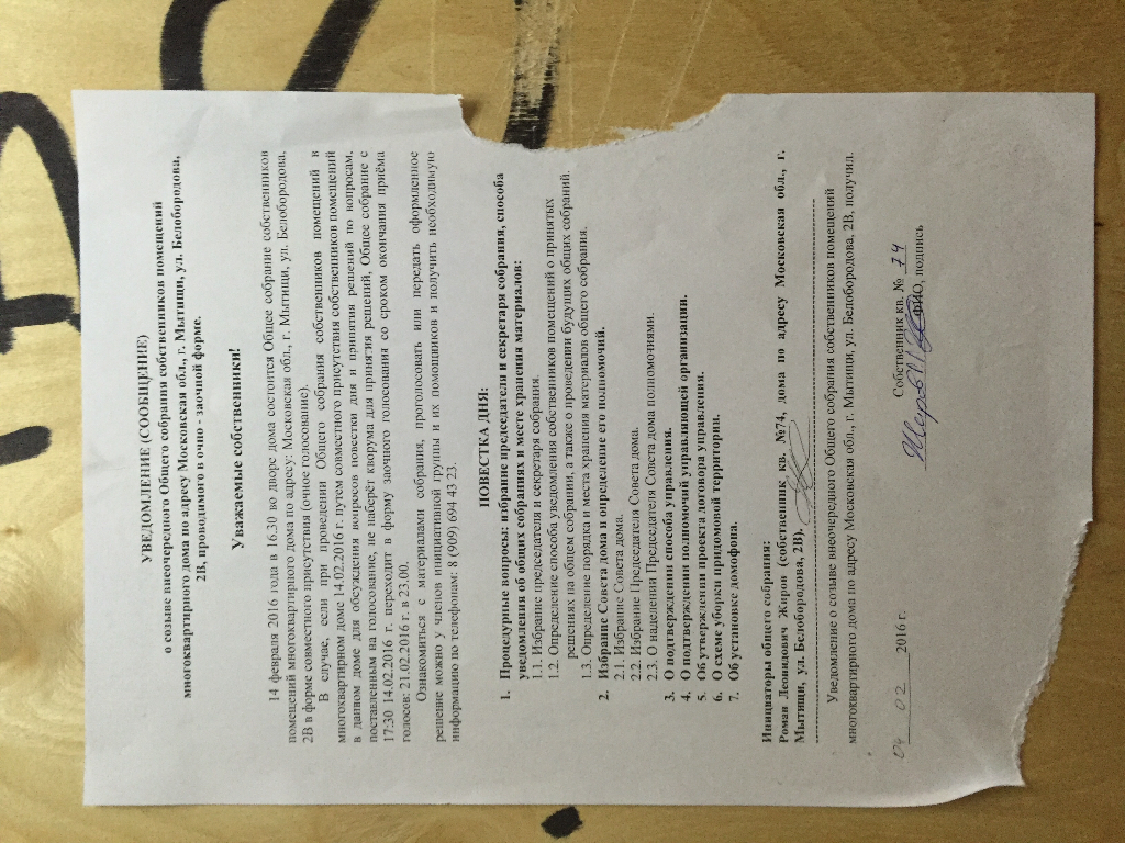 Уважаемые форумчане! Прошу объяснить, правомерно ли проведение голосования, при вот такой форме уведомления? Объявление вывешено в лифте 12 февраля, при том, что в самих листовках указывается дата 4 февраля. Ну допустим, лежали в почт. ящиках-не заметили..И как я поняла, только один собственник ( инициатор) был уведомлен под роспись.