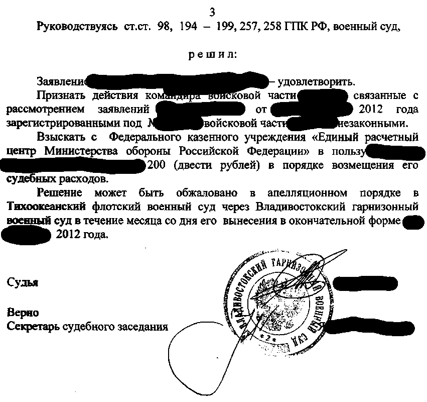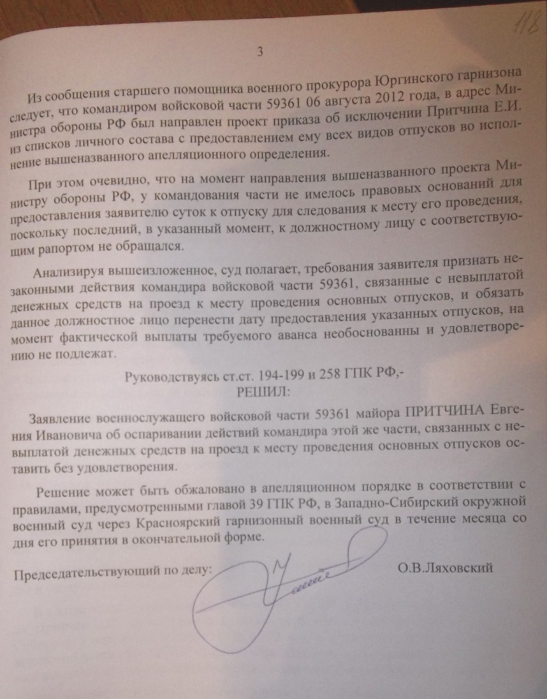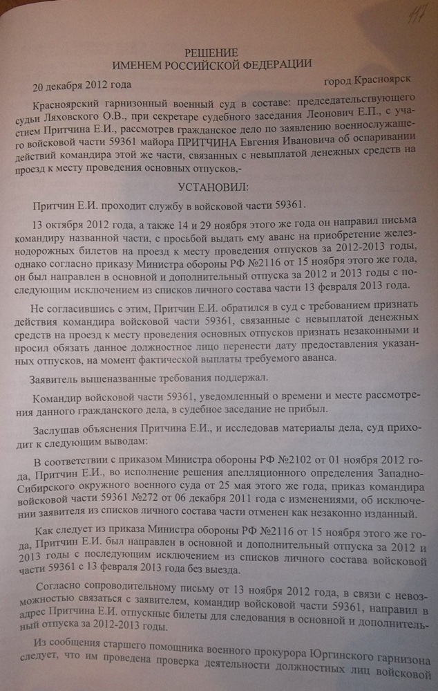 Предлагаю обсудить и помчоь мне с апелляцией в моем деле. Суть - служу за Уралом, положен безвозмездный проезд в основной отпуск. Написал командиру 3 рапорта перед отпуском с просьбой обеспечить меня либо В П Д, лтбо авансом для приобретения жд билетов, а также увеличить продолжительность основных отпусков ( у меня их два подряд перед исключением - за 2012 и 2013гг). КЧ на мои рапорта проигнорировал полностью,ничего не сделал, что я просил. Я подал в суд, суд полностью мне отказал. Решение суда, считаю, просто ни о чем. Итак... прилагаю свое заявление, пояснения к заявлению и само решение суда.