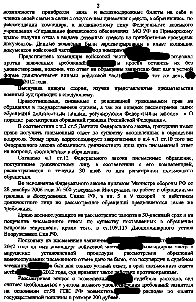 2. Мной были направлены в адрес командира в/ч 59361 рапорта от 13 октября 2012г, 14 ноября 2012г, 29 ноября 2012г., в которых, помимо прочего, я просил реализовать мое право на проезд к местам проведения основных отпусков г. Санкт-Петербург и выдать мне аванс для приобретения билетов. Кроме того, в рапорте от 14 ноября 2012г. я просил командира части выдать мне либо проездные, либо аванс для этих целей.