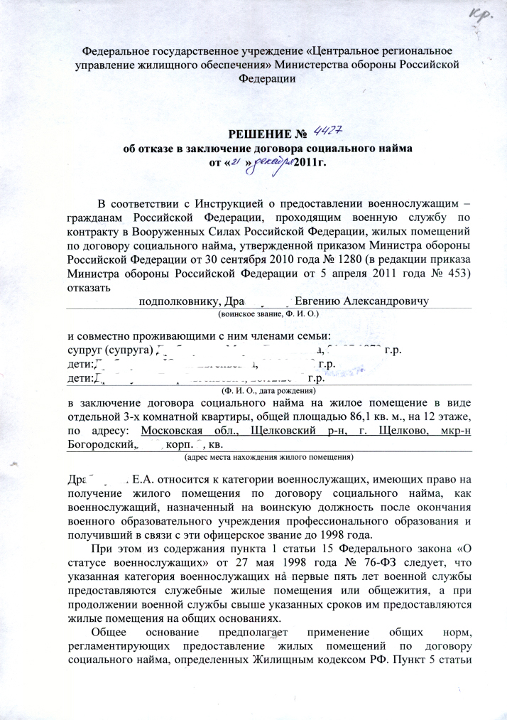 Сегодня получил таки отказ. В принципе ожидаемый. Что теперь? Отказ от 21.12.11. Получил 28.02.12. На эту дату у меня до увольнения по предельному возрасту менее чем 3 года. Этот отказ считать неправомерным и можно на решение ЦРУЖО подавать с суд? Или в суде примут во внимание, что извещение ещё до волшебной даты - 3 года? Каково содержание фразы - "только при увольнении военнослужащего с военной службы"? На словах мне сказали 0,5-1 год до увольнения. Я попросил подтвердить законодательно, сказали, обращайтесь в суд. Это защитная реакция или подсказка, как нужно действовать? С 21.12.11 изменений в реестре пока нет. У кого подобная ситуация?