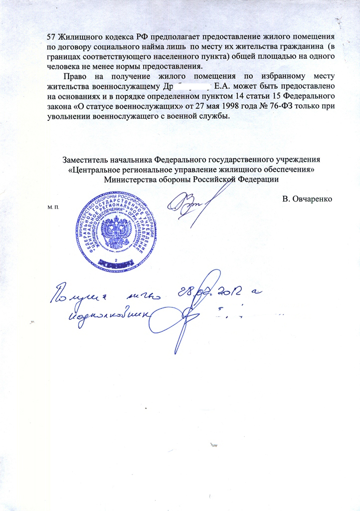 За 2,5 года нахождения в распоряжении нам, признанным нуждающимися в УЖУ, как по месту, так и в ИМЖ (есть в реестре) не пришло ни одного извещения. Зато тем, кто увольняться даже и не собирался, имеет служебное жилье по нормам, до 20 лет выслуги и предела, как до Китайской пасхи, а первый контракт много позже 1998 г, уже приходят по второму разу (первый раз Кузнецы, второй Чехов). А это на другом конце страны, то есть явно не по месту дислокации))). На что командир им сказал: «Оформляйтесь!»