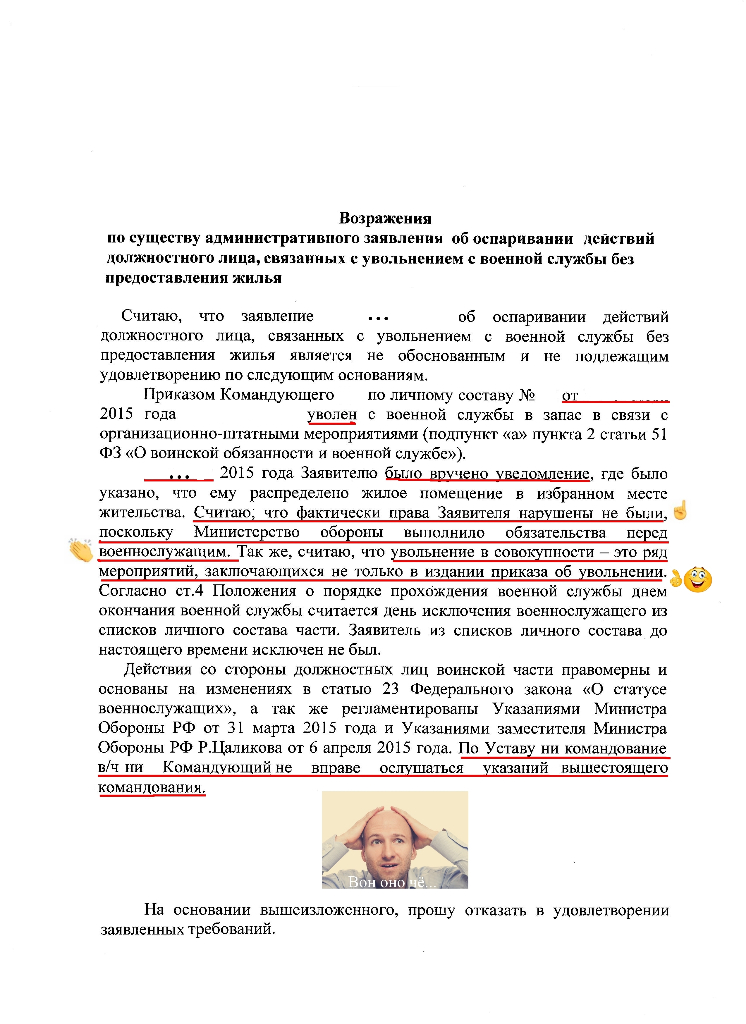 #3021Откуда тогда интересно взялись квартиры, если ранее не было???QR_BBPOST Ситуация стала интересна тем, что после увольнения как из рога посыпались извещения на уже уволенных, что нашло отражение в решениях. И аргумент об отсутствии жилья в ИПМЖ и отказ от ЖС стало труднее отстаивать, да что труднее...практически невозможно. Типовое возражение