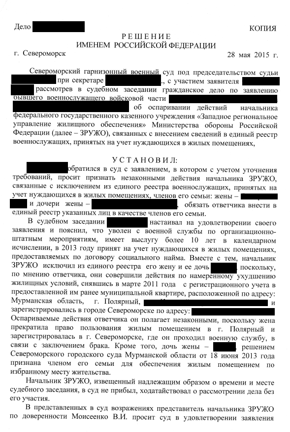 само уведомление об исключении жены и ее дочери из нуждающихся не нашел, в принципе в решении суда и апелляции мнимые основания ЗРУЖО понятны