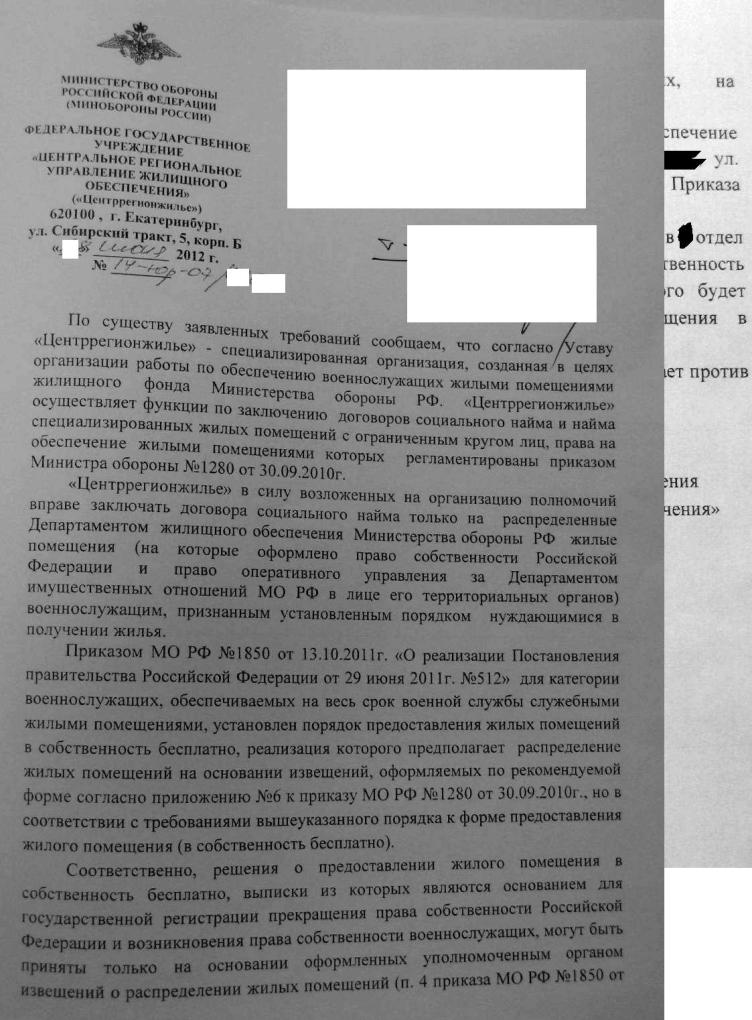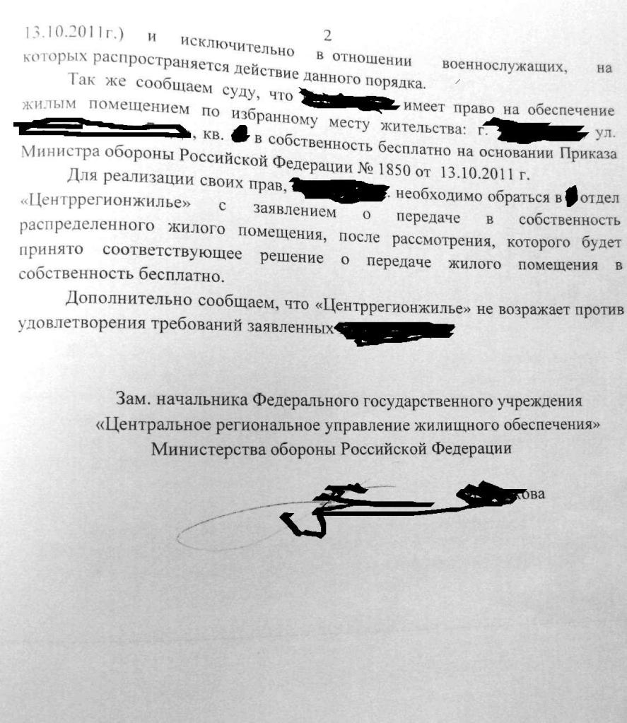 Извещение мне выписано было 15.05.2012 г. по адресу г.Подольск, ул.Генерала Смирнова дом 14 кв.___. Получил извещение на руки и написал согласие 04.06.2012 года, 06.06.2012 г. прибыл в актовый зал ЮРУЖО для проверки документов в своем учетном деле. Перед началом проверки документов я предъявил делопроизводителю заявление согласно приложения №1 ПМО №1850 и сказал, что я прибыл получать жилье сразу в собственность, на что она была в недоумении и сказала, что она не знает о чем идет речь, они работают только по ДСН. Я сделал хитро, перед тем как зайти в актовый зал, зашел к ИО начальника и спросил: Восточное РУЖО уже давно работает по ПМО №1850, а ВЫ почему нет? На что она сказала, что и они тоже работают. Поэтому перед тем как зайти в актовый зал я был заручен поддержкой начальника и сказал делопроизводителю, то, что Вы не занимались оформлением жилья в собственность не значит, что Вы не обязаны этого делать. Ваш начальник сказал, что ЮРУЖО во всю работает по ПМО №1850. После чего она куда-то убежала и через некоторое время пришла со словами, что да действительно я был прав, но она еще толком не понимает механизма и не знает как это делать. Далее она приняла мое заявление, проверила документы, сказав, что необходимо обновить. И самое главное отличие от ДСН, что сначала посылается запрос в ЕГРП на всех членов семьи, а после получения ответа делается решение. А за этот месяц она разузнала что, да как. Ответ из ЕГРП я получил 4.07.2012 г. – за членами моей семьи ничего не числиться. 04.07.2012 г. сдал служебку, выписал всех членов семьи. В связи с тем, что мой дом еще не сдан, а потерять квартиру не хочется, сделал следующее – 04.07.2012 г. на E-mail: podolsk@slav-ex.ru отправил письмо с просьбой разъяснить, когда я смогу заселиться в распределенное мне жилое помещение, ответ так же по электронке мне пришел минут через 30. 06.07.2012 г. в ЮРУЖО получил на руки выписку из решения и акт приема-передачи. Чтоб не уволили раньше срока сдачи дома в эксплуатацию, я написал в ЮРУЖО заявление, но как это сработает не знаю. Это доки которые я получил: Дальше уже в Подольске как дом примут буду действовать.