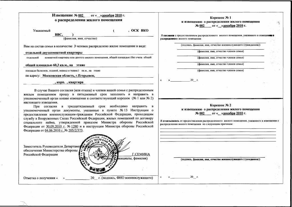 #3185Здравствуйте всем! Сегодня тоже получил письмо "счастья" на квартиру в НЕизбранном мной ПМЖ. Судя по дате выписки извещения - пролежало два месяца в ожидании "гонца" из части. Буду отказываться в надежде на жильё и город которые меня устроят, да и может к концу 2011 всё же наладится и упростится порядок оформления жилья - уж больно геморройно оформить справку по недвижимости за всю Россию и в сроки хрен уложишься. Беспокоит вопрос - когда теперь ждать следующего раза и "маны небесной". Абсолютно не ясен порядок работы ДЖО с отказниками и последующему формированию очереди. При этом на сайте http://dom.mil.ru отсутствует какая-либо информация в отношении КЭЧ в управлении которых находятся построенные дома - куда ехать и где КЭЧ искать, если прежде чем появится желание дать согласие на получение предложенной квартиры, съездить и посмотреть а то может там котлован?!
