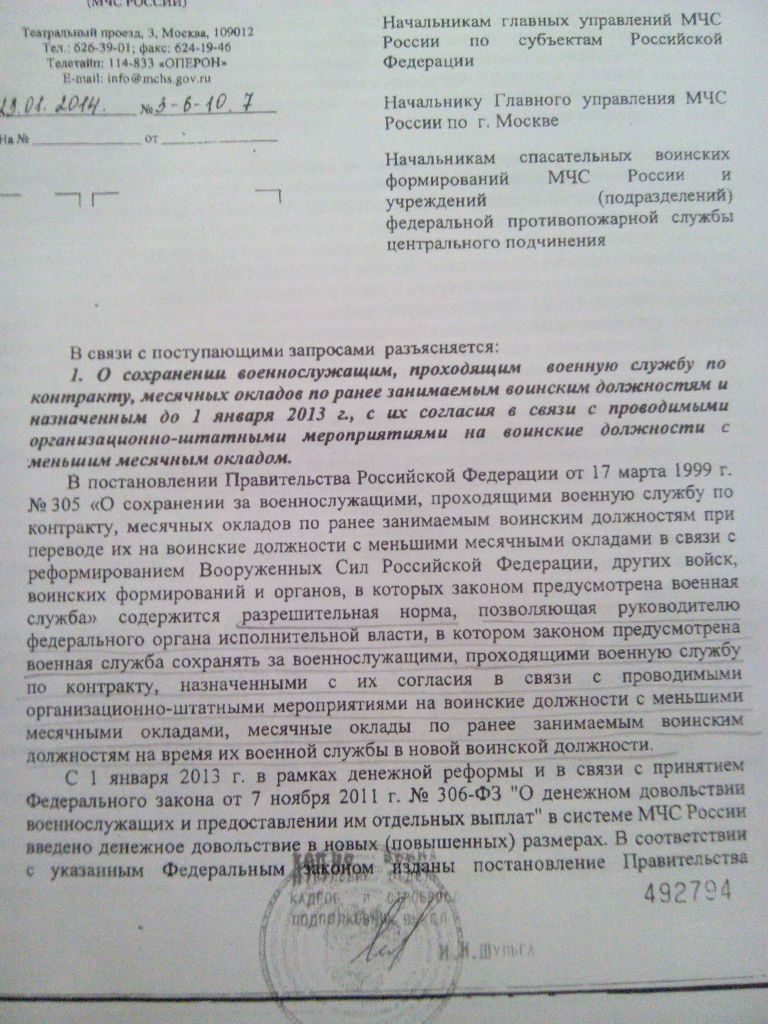 В разъяснении МЧС России от 23 января 2014 года за № 3-6-10.7 на мой рапорт на имя начальника ЦУКС указано на то, что в ПП РФ от 17 марта 1999 года № 305 содержится разрешительная норма, позволяющая руководителю федеральных органов исполнительной власти, в которых законом предусмотрена военная служба сохранять за военнослужащими, проходящими военную службу по контракту, назначенных с их согласия в связи с проведенными ОШМ на воинские должности с меньшими месячными окладами, месячные оклады по ранее занимаемым воинским должностям на время их военной службы в новой воинской должности.