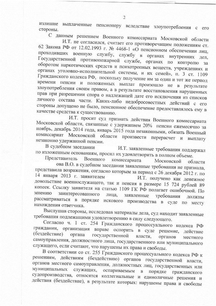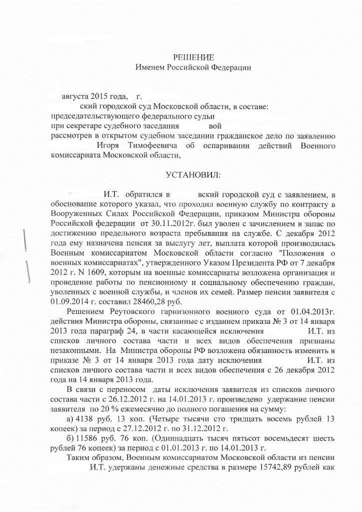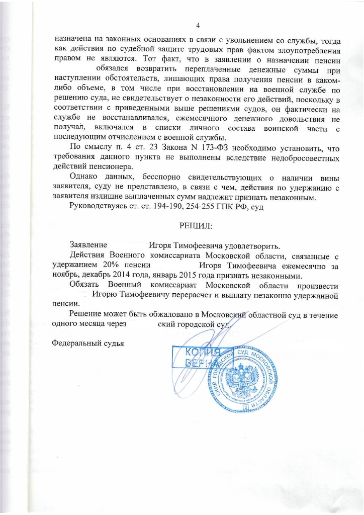#3229В продолжение постов 3151, 3153. Выкладываю решение суда в пользу в.пенсионера. Может, кому пригодится для оспаривания незаконного удержания из пенсии. Это решение ВК МО обжаловал, пока только в короткой апелляции. Как только составят полную, сообщу их доводы, почему не согласны с решением городского суда.