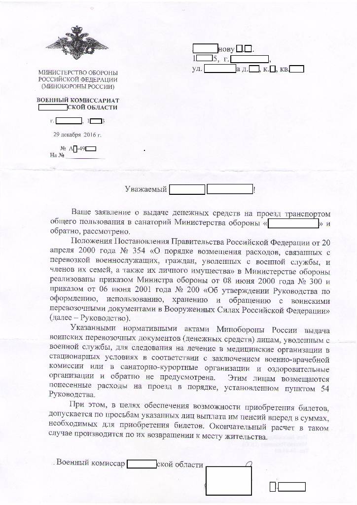 Всем спецам в правовом вопросе Добрый день!. Военный пенсионер, жена по путевке едет в военный санаторий Феодосия, первый раз. Вопрос №1: Должны ли сроки прибытия и убытия из санатория совпадать с датами в проездных билетах. В военкомате( г Тверь ) заявили: "Вы же едите на санаторно-курортное лечение, которое определено сроком путевки и билеты должны быть такие же" Из опроса сослуживцев некоторые военкоматы на дату не смотрят, а только на соответствие маршрута и подлинность предоставляемых документов. Вопрос №2 Самолетом Москва-Симферополь и далее до Феодосии или Москва-Анапа и далее автобусом или катамараном до Феодосии, какой правильный маршрут, для компенсации оплаты в военкомате. Есть вариант возвращения ж.д транспортом из Анапы, но разные даты проезда парома и поезда до Москвы из Анапы, не единый проездной билет. Самостоятельно еще долечиться 10 дней в Анапе.