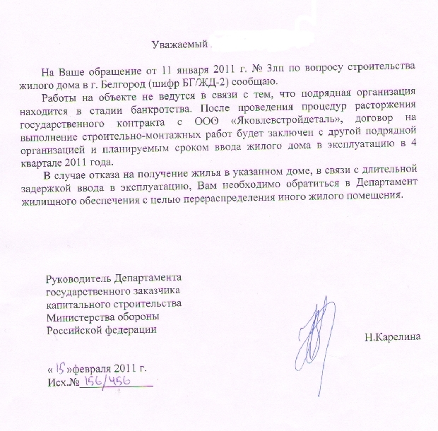 не обращай внимания, мне пришла такая же хрень, не куда не поехал. командиру отдал ответ от на мой запрос от "Яковлевстройдеталь" где черным по белому написано что ОЖИДАЕМАЯ сдача дома в 2 квартале 2011 г. Все успокоились сразу.