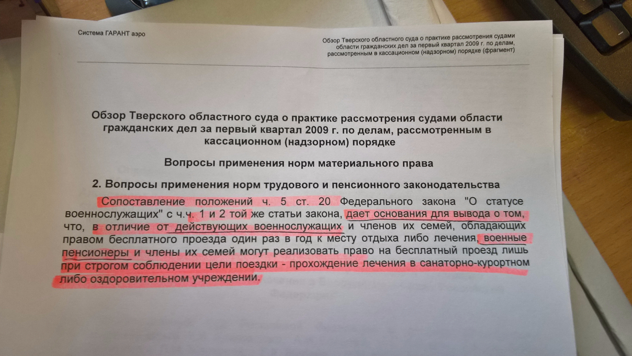 Обратите внимание - данный обзор написан ещё году в 2009-ом (так как обобщается судебная практика областного суда за 1-ый квартал 2009г.). А фраза "военные пенсионеры и члены их семей могут реализовывать право на бесплатный проезд лишь при строгом соблюдении цели поездки - прохождение лечения в санаторно-курортном либо оздоровительном учреждении" как раз и свидетельствует о том, о чём я написал выше. Ибо нет и быть не может никакого ЛЕЧЕНИЯ в оздоровительных организациях, которые не являются медицинскими и не имеют лицензии на медицинскую деятельность....Нарыл первоисточник. Получается, что фраза вырвана из контекста. В приложении текст полностью.