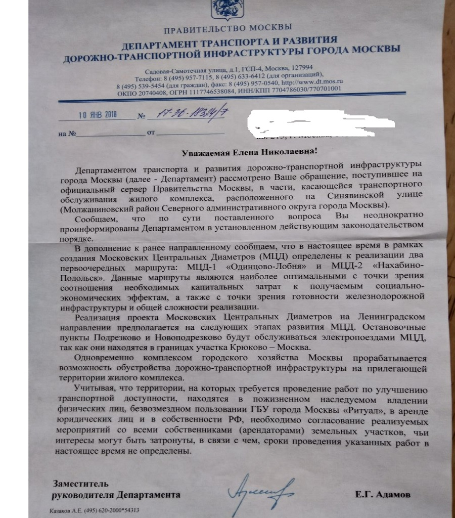 #33246Ну вот имеем более пространный ответ на обращение уже Собянину. Из ДТ перестали дразнить отпиской об обеспечении жителей маршрутами 400, 817, 851 и 865 до метро. Большего из Адамова уже не выжать. Однако, если на этом успокоиться, то шаблон будет работать еще долго.
