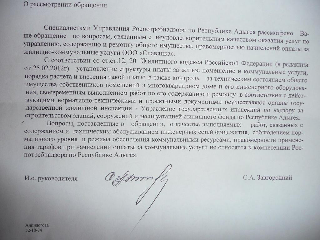 Письмо писалось в три адреса- Роспотребнадзор, Жил.инспекцию, Начальнику Гарнизона. Первый ответ пришел из Роспотребнадзора. Мы потребители услуги предоставляемой Славянкой, УК обсчитывает нас при расчете за предоставленные услуги. Ну и как заставить их работать ?Вам посоветовали написать в другой надзорный орган, так не тяните, пишите туда.