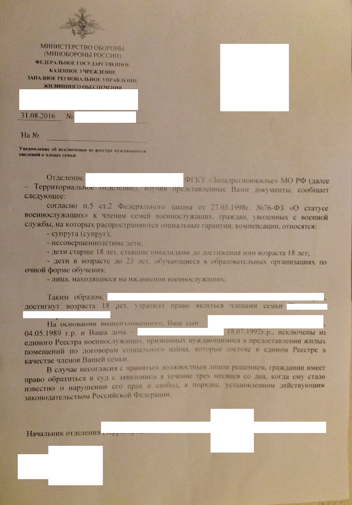 #34515Совершенно ожидаемое действие РУЖО. Странно, что для Вас это стало неожиданностью. Всё в соответствии с ФЗ-76. Однако он имеет более низкий юридический статус, чем ЖК. В соответствии с ЖК признавайте детей членами семьи по суду. Разумеется при условии совместного их с Вами проживания. Ситуация не редкая, судебная практика положительная.QR_BBPOST Получена вот эдакая копия уведомления