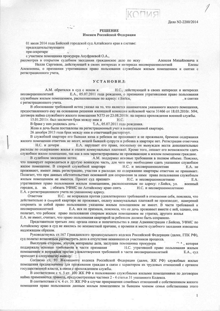 Коротоко напомню свою проблему: получил служебную квартиру на себя, жену и сына. Впоследствии развелся, и с служебки съехал оставив бывших членов семьи в ней (на тот момент и у бывшей жены и у сына в собственности были жилые помещения в другом городе). Потом меня вывели в распоряжение и поставили в очередь на постоянное жильё. Три года ничего не предлагали,а потом предложили Московскую область. И тут выяснилось, что квартиру я не получу пока у меня не будет справки о сдаче служебного жилья. Бывшая жена выписаться и съехать с служебки категорически отказалась (на этот момент у неё уже была в собственности 1/2 трешки том же городе, что и служебка. Ну и в другом городе собственность осталась). Я обратился в районный суд с иском о признании утратившими право пользования служебкой бывшими членами семьи, но суд отказал на основании того, что с таким иском может обратиться только собственник служебки, а не наниматель. И тут началось самое интересное, за прошедшее время войсковая часть, которая мне распределила служебку была расформирована и частично приватизирована (то есть хранение - новая часть, производство - ОАО). И моя служебка в числе еще 8 таких квартир оказалась ничьей. Должны были передать КЭЧи не передали, а потом и КЭЧи не стало, а в ДИО их вообще нет. Далее примерно 2 года переписки с различными организациями МО РФ (с теми, что в Екатеринбурге, через гарнизонный суд, на мои заявления просто не отвечали, зато по решению суда - сразу). И как итог 4 июня суд удовлетворил мой иск в полном объеме. Во вложении моё исковое заявление и решение суда.